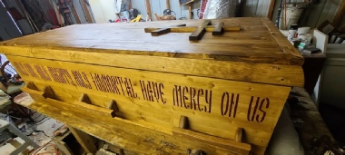 The caskets are simple rectangular casket made from solid wood with handcrafted trim at top and bottom. Includes Custom hand cut Oak handles (unfinished interior). Pine Casket: $1100.00